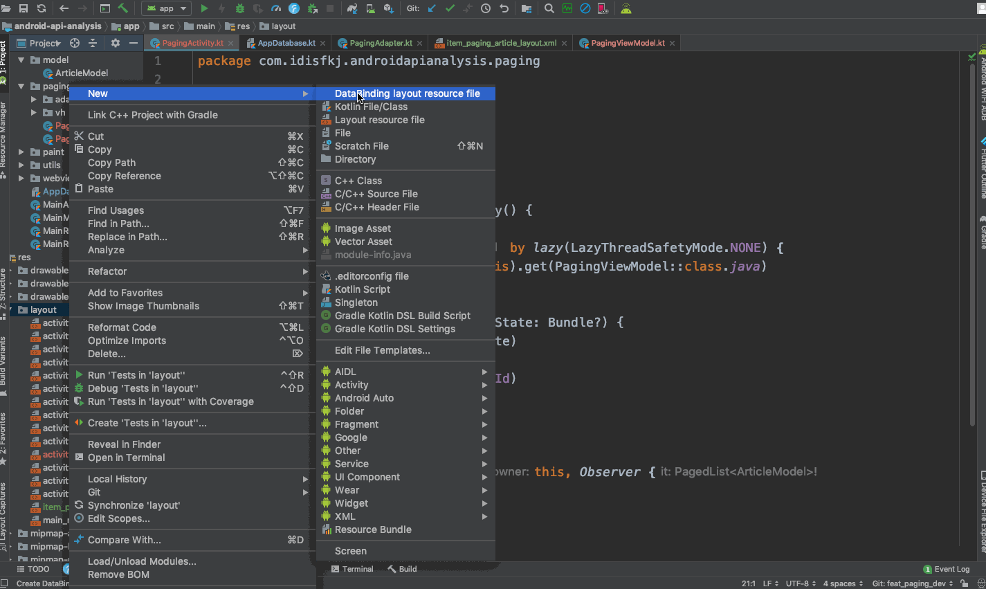 就如上面的gif效果图一样,首先第一步是通过layout文件节点,弹出菜单列表,最后在New选项子列表中呈现Databinding layout resource file选项。如下图所示